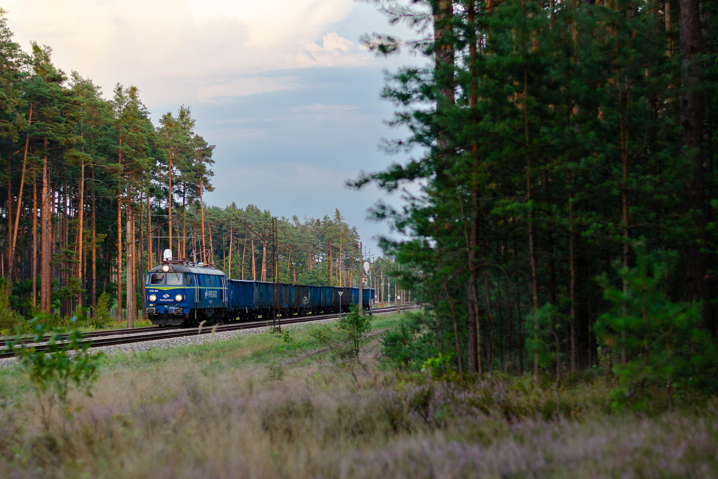 ET22-654 prowadzi krótki skład węglarek mijając tarcze ostrzegawczą stacji Łętownia którą pociąg minie na biegu kierując się na Stalową Wolę