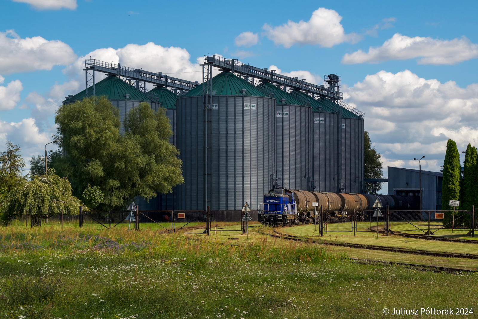 SM42-731 Orion w służbie Lotos Kolej wtacza 5 wagonowy skład cystern na teren magazynu zboża Elewarr, skąd ruszy luzem po stojące na torze obok 2 cysterny, które wtoczy na teren zakładu ADM Malbork, gdzie odbędzie się ich załadunek.