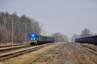 Braniewo. Na stacji towarowej manewruje szeroka Tamara TEM2-018 firmy DB Cargo, z wagonami RŻD.