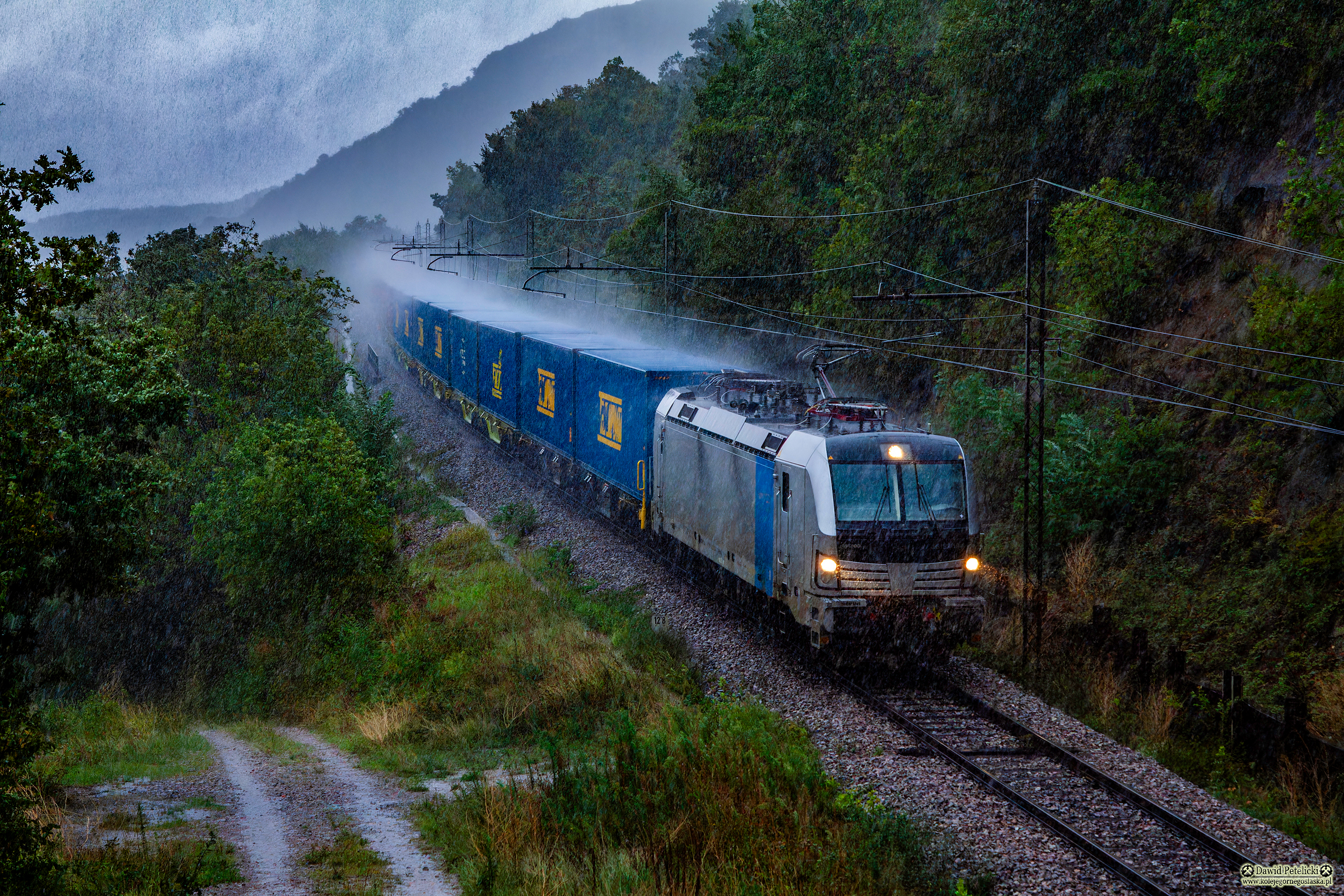 ||Szlak Črnotiče - Hrastovjle|| 6193 104 pracująca dla LTE zjeżdża w dół malowniczej linii kolejowej do portu w Koprze.