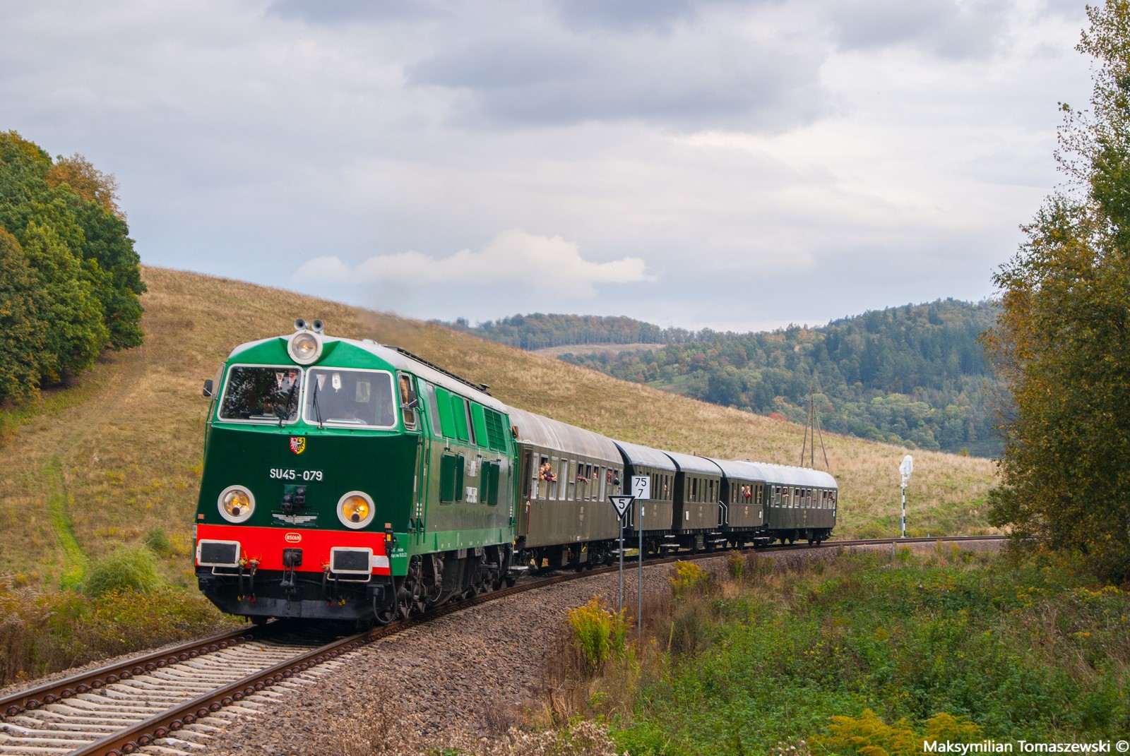 SU45-079 KSK Wrocław z pociągiem specjalnym "Wielka Sowa" relacji Wrocław Główny - Jedlina-Zdrój pokonuje odcinek linii 266 w okolicy Olszyńca. Skład uruchomiono w ramach trzeciej edycji przejazdu "Pociągiem w Góry Sowie".