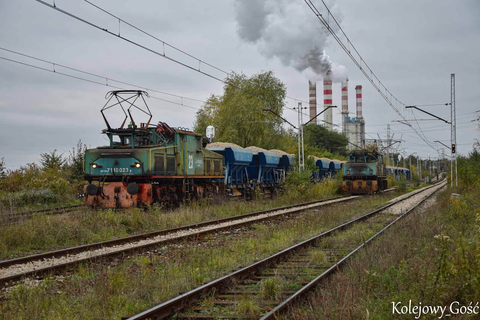 EL2-23 wykonuje manewry z składem szutrówek z tłuczniem, na drugim planie widać EL2-07 który wcześniej razem z sztuką 23 przyjechał z szopy.
