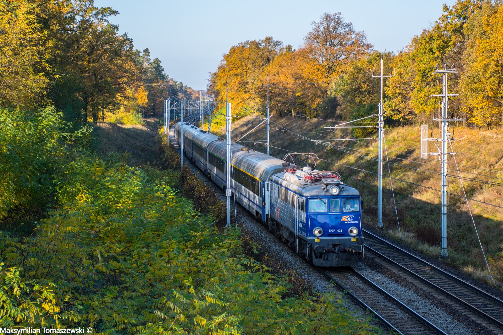EP07-1032 z pociągiem IC 73104 Mehoffer relacji Zielona Góra Główna - Przemyśl Główny pokonuje szlak podg. Szczedrzykowice - Malczyce w słoneczny listopadowy poranek. Jak widać w porównaniu z kadrem z przed 2 tygodni drzewa w tle całkowicie pokryte są już kolorowymi liśćmi, które oznaczają pełnię jesieni.