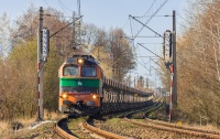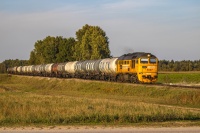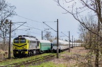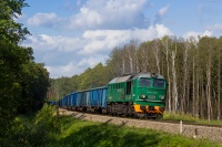 Duet gagarów z ST44-2054 na czele, ciągnie długi skład węglarek. wspinając się efektownie pod wzniesienia przed Szczebrzeszynem. Tam zaliczy krzyżowanie z pociągiem jadącym w kierunku wschodnim.