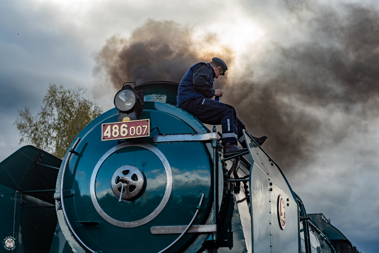 Czeski kolejarz dosiada swojego konia przed jazdą do Ebersbach. Tak mi się skojarzyła ta scenka - koń i jeździec. Tak na prawdę to czeski kolejarz pozował na parowozie ;) . Za konia robi piękny 486.007 "Zelený Anton".