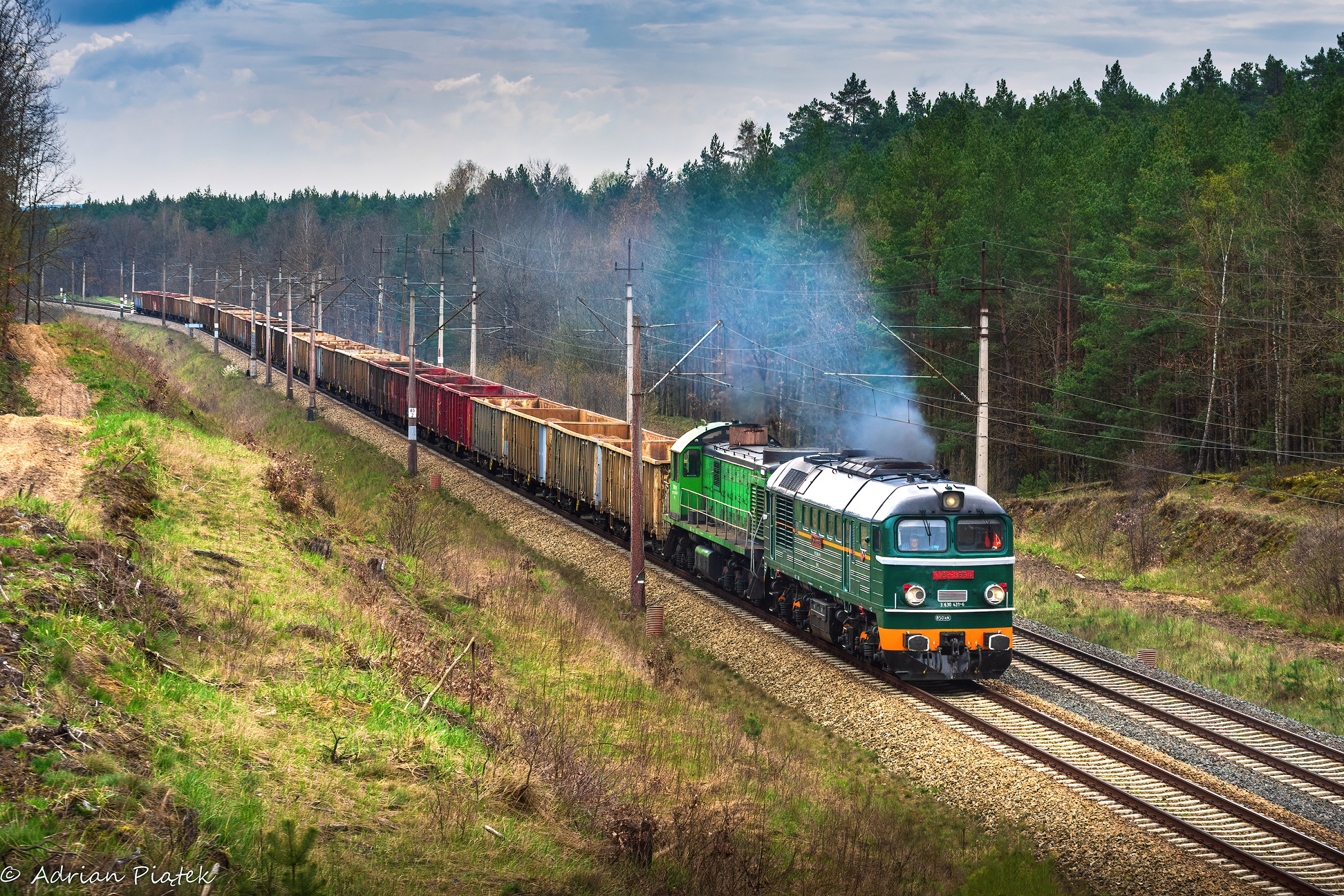 M62-3554+TEM2-075 ze składem węglarek z Wałbrzycha do Chojnic cisną szlakiem z Dziembówka do Piły Głównej.