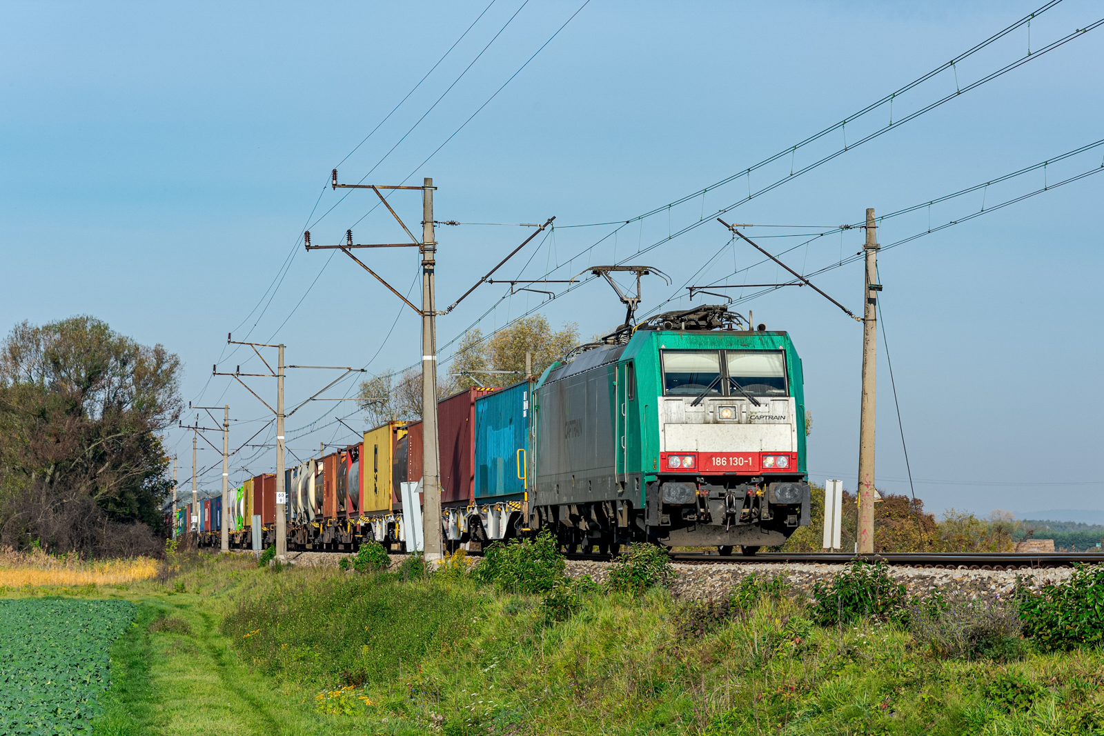 Traxx w służbie Captrain Polska z Alpha Trains z pociągiem towarowym nr 761000 rel. Oderbrücke - Brzeg Dolny mija przedmieścia Ścinawy jadąc w pogodne popołudnie szlakiem podg Chełmek Wołowski - Ścinawa w stronę Wołowa.