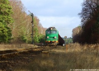 M62-1205 w duecie ze Zbyszkiem M62-1077 prowadzą ładowny pociąg 644066/7 relacji Kamieniec Ząbkowicki — Zawiercie GT przejeżdżając na biegu przez podupadłą stację w Głogówku.