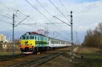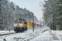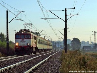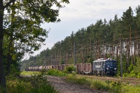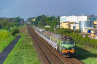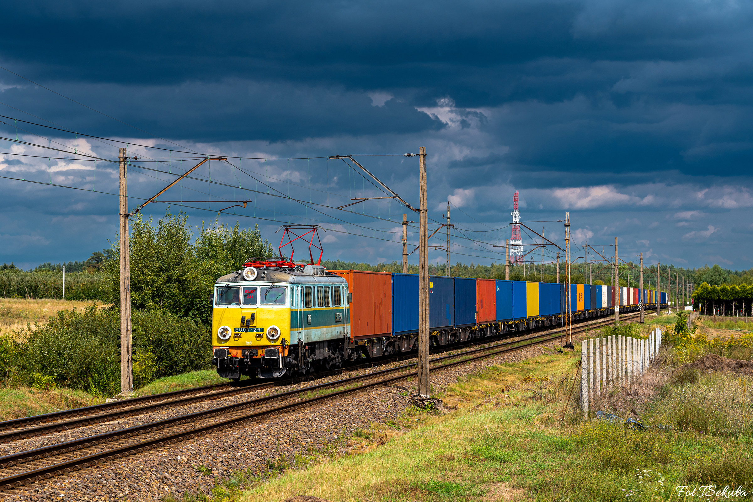 EU07-241 z platformami załadowanymi kontenerami z Małaszewicz,uciekając przed ulewą zbliża się do dawnego przystanku Jeżewice.