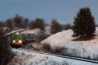 SU45-079 ze składem retro: "Kalenica" pokonuje długą prostą i wiadukt w Głuszycy Górnej i kieruje się w stronę Jedliny Zdrój.