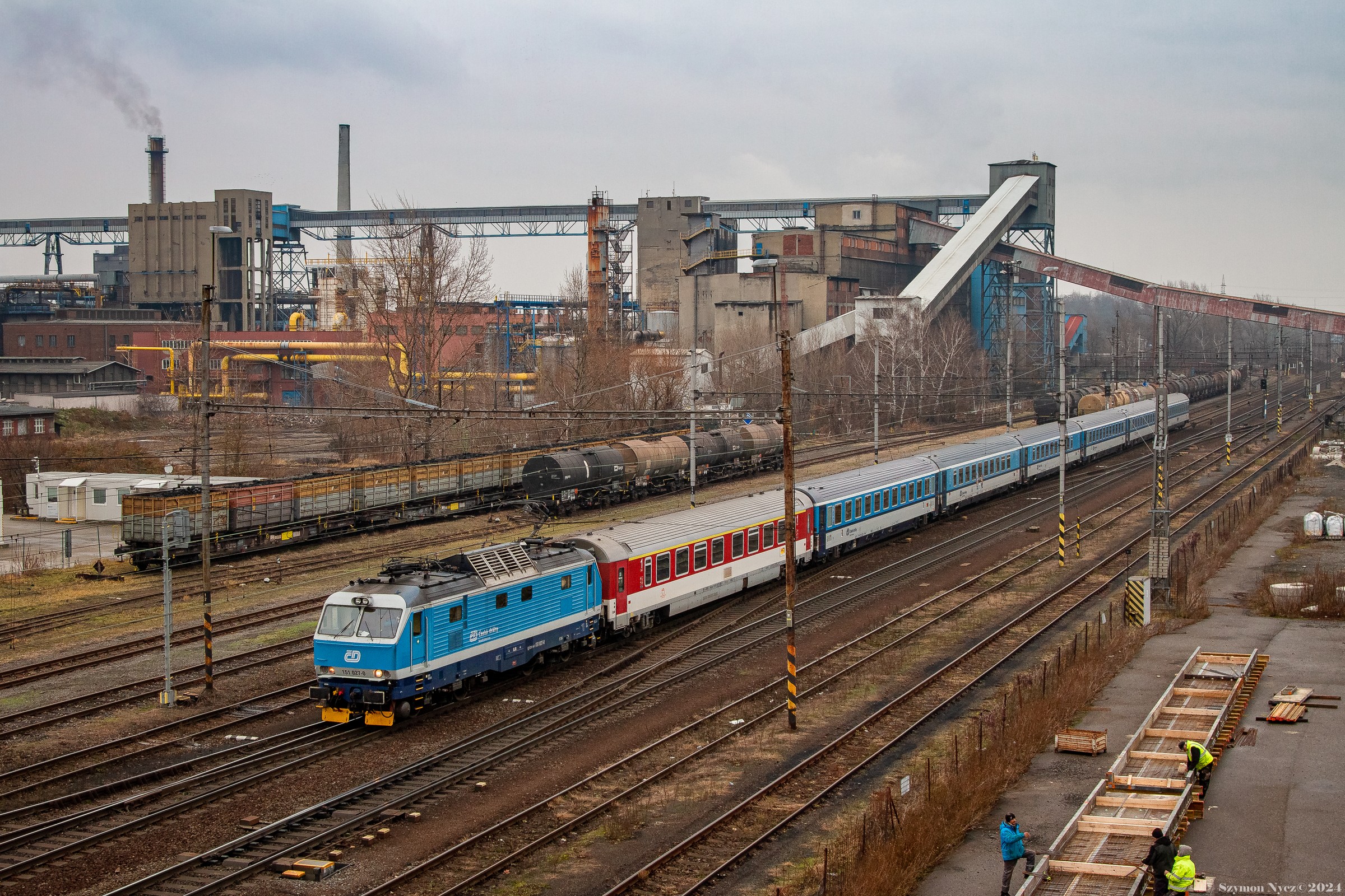 151 027-0 z pociągiem EC 142 "Ostravan" relacji Žilina - Praha hl.n. zbliża się do stacji Ostrava hl. n., na której odbędzie krótki postój handlowy. Maszyny z serii 150/151, które były ikoną linii Praha - Bohumin - Żylina wraz z niedzielną korektą rozkładu jazdy zniknęły z obsługi pociągów w rejonie Ostravy w związku z planowanym wprowadzeniem systemu ETCS na głównych magistralach z początkiem przyszłego roku.