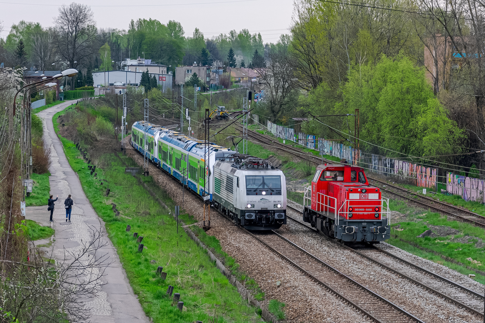 Eurosprinter ze składem 2 Flirtów serii ATR 803-009+010 rel. Siedlce - Chałupki mija się z luźnym Holendrem Rafałem jadąc szlakiem podg Brynów - Katowice Ligota w stronę Tychów.