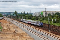 Najstarsza dziewiątka EP09-001 rozświetlona przez zachodzące słońce prowadzi skład IC 3804 Matejko relacji Przemyśl Główny - Szczecin Główny. Pociąg porusza się szlakiem Wołów - Małowice Wołowskie i minie zaraz przystanek w Orzeszkowie.