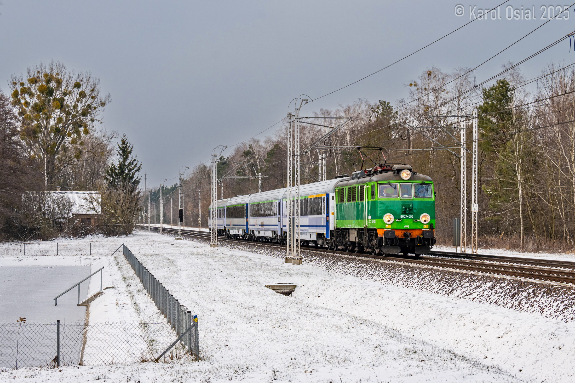 EU07-052 z pociągiem IC Jadwiga z Krakowa Gł. do Lublina Gł. minęła przystanek w Gołębiu i zbliża się do stacji Puławy Azoty.