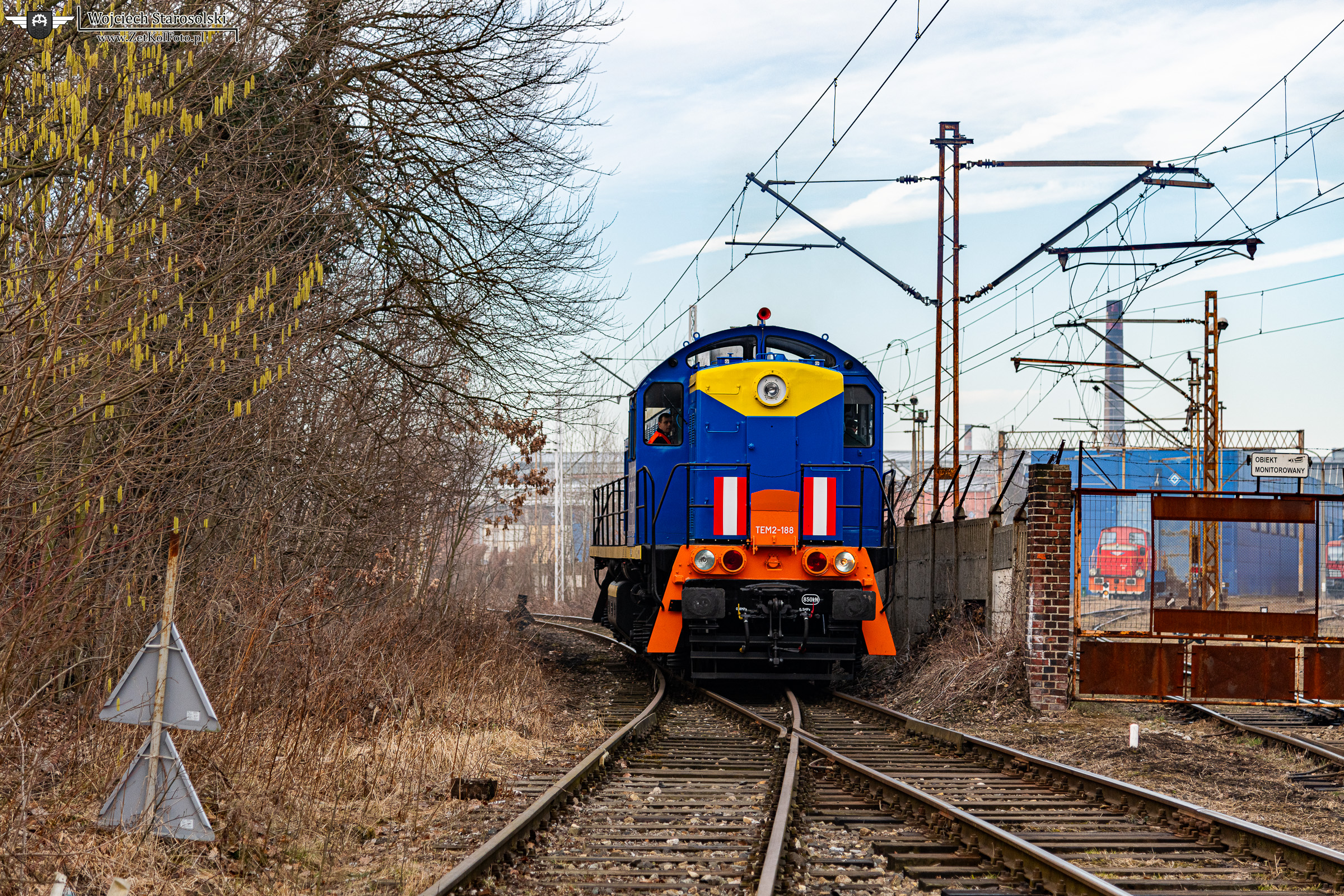 TEM2-188 luzem pokonuje bocznicę zakładu NEWAG w Gliwicach (Dawne ZNLE) w kierunku stacji Gliwice. Maszyna była tutaj na ważeniu. Po zgłoszeniu się w Gliwicach lokomotywa pojedzie do Lublińca na jazdę próbną, a później do Pyskowickiego ASCO Rail, gdzie przechodziła naprawę. Dawniej w tym miejscu jeździły składy do i z szybu Maciej KWK Concordia, który obecnie jest ujęciem wody pitnej, a także funkcjonuje na jego terenie bistro czy restauracja.