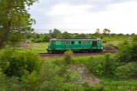 Rumcajs o numerze 355 w duecie z ET22 wolnym krokiem przemierza linię Legnica - Jerzmanice Zdrój, mijając na biegu stacje w Złotoryi.