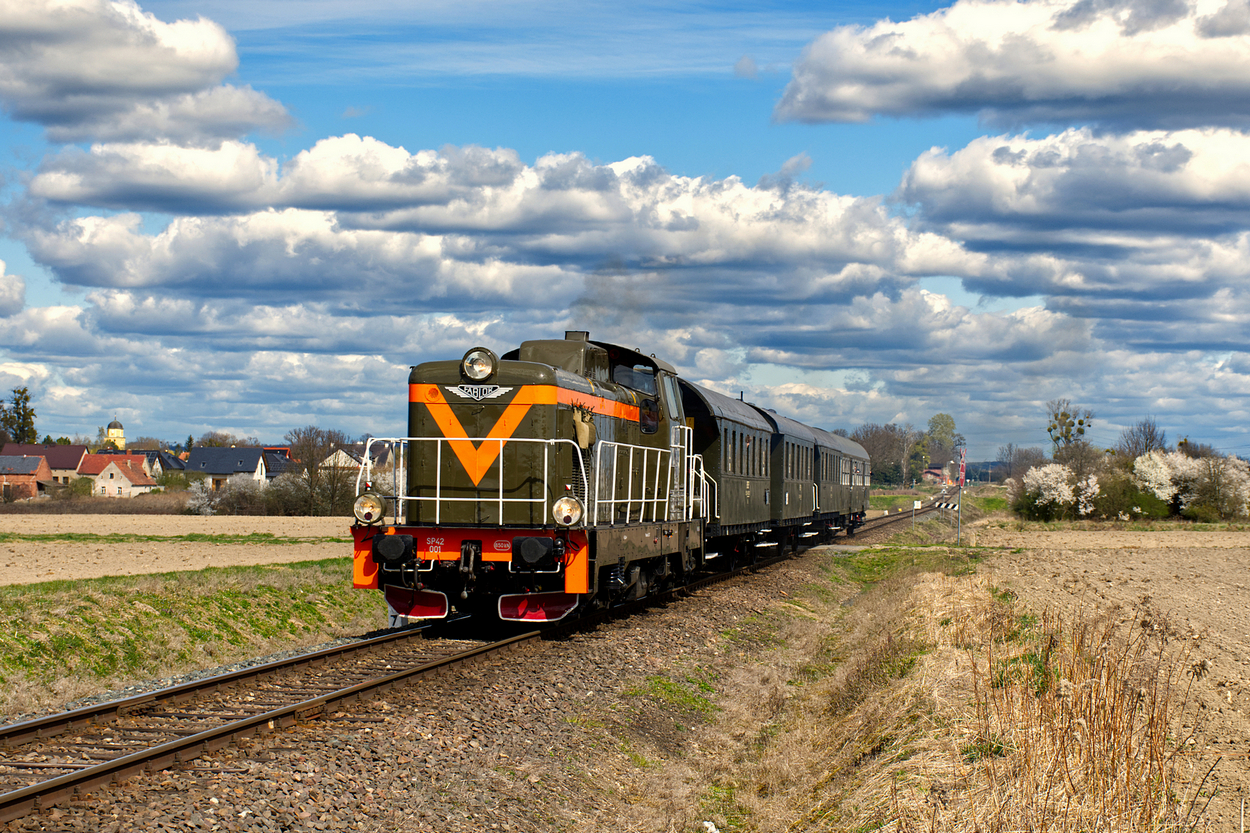 SP42-001 z pociągiem specjalnym KSK Wrocław z Trzebnicy do Wrocławia Głównego mija zabudowania wsi Pasikurowice.
