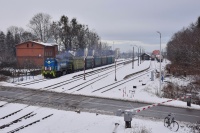 Lokomotywa TEM2-243 należąca do spółki JSW Logistics w ulewnym deszczu zbliża się do podg. Krywałd by tam poczekać na TEM2-288, którą na końcu składu pociągnie wraz z pustymi radwanami do KWK Szczygłowice.