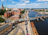 SM42-110 z platformami z podkładami oraz suwnicami od PUNa wyjeżdża z Wałcza w kierunku Piły.