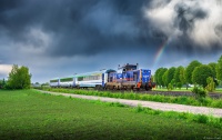 Gama ze składem zielonych beczułek niczym gąsienica wspina się na drobny pagórek znajdujący się pomiędzy stacjami Zaryń- Babiak.