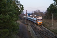 EP08-001 ze składem pociągu TLK 51110 "Biebrza" relacji Gdynia Główna - Białystok mija okolice wsi Szałstry, jadąc szlakiem Gamerki Wielkie - Olsztyn Gutkowo.