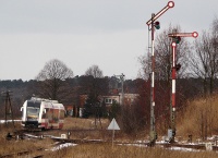 18 luty 2009 - Stęszew || Pesobus jako pociąg osobowy z Wolsztyna do Poznania, opuszcza Stęszew. W tle semafor wjazdowy na stację.