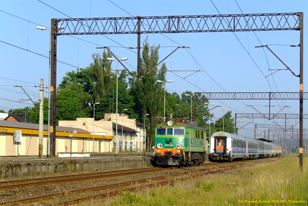 Wejherowo | 08.06.2007 | EP07-372 podstawia się pod skład... "Norwida", który pojedzie w relacji Wejherowo - Kraków Główny. Powodem tej sytuacji był remont przejazdu kolejowego i układu torowego na stacji Bożepole Wielkie. Nie jeździły wtedy od str. Słupska do Gdyni żadne pociągi pospieszne, więc "Norwid" i "Opolanin" miały wydłużoną relację.