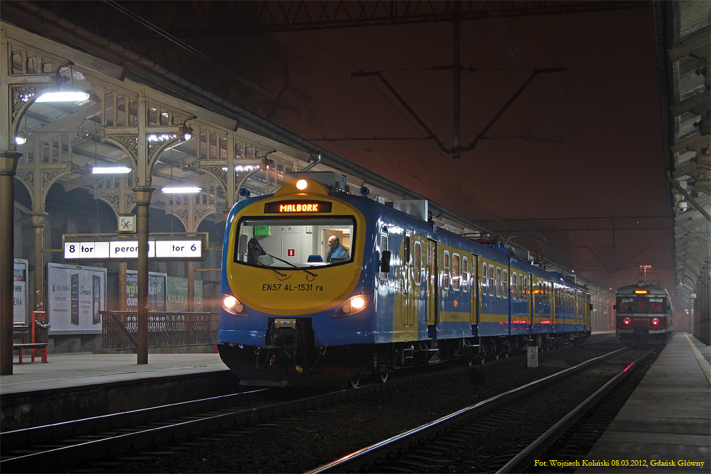 Jedyny na razie taki kibelek (będą 4) w pomorskim zakładzie spółki Przewozy Regionalne w peronach stacji Gdańsk Główny. Jedzie on z Gdyni Chyloni do Malborka. Po prawej sąsiaduje EN71-017, jest to Interregio "Pomorze" (Warszawa Wschodnia - Gdynia Główna).