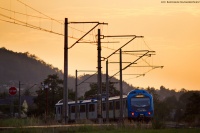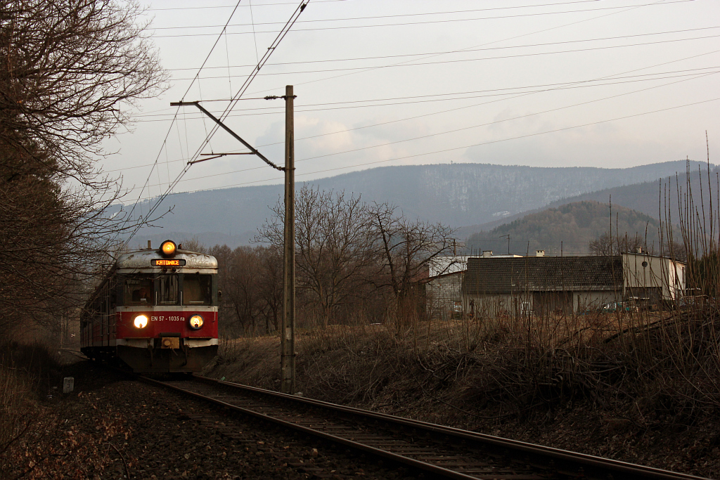 EN57-1035 jako Regio 318 do Katowic przed minutą opuścił stację w Ustroniu i podąża w kierunku Goleszowa. W tle góra Czantoria.