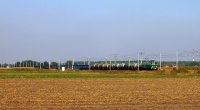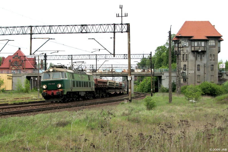 5 maja 2009. Pociąg towarowy "byku" z wagonami samowyładowczymi przejeżdża pod wiaduktem w Nowych Skalmierzycach. Po prawej stronie zdjęcia widzimy nietypową nastawnie.