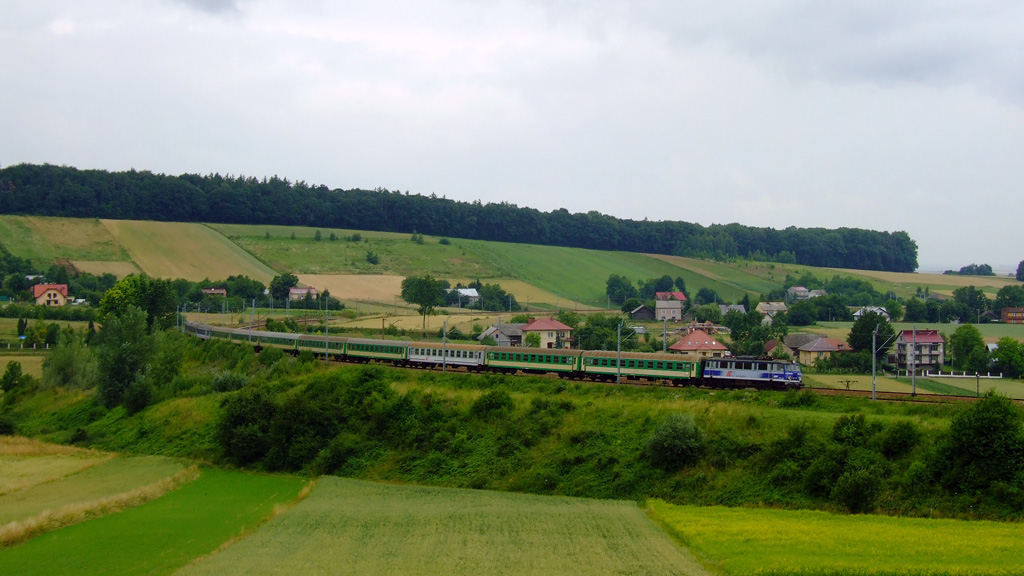 EU07-230 z długim sezonowcem z Helu do Krakowa mija przystanek Goszcza. Miejsce bardzo ciekawe i znane. Świetnie wyglądają składy zjeżdżające z góry po łukach.