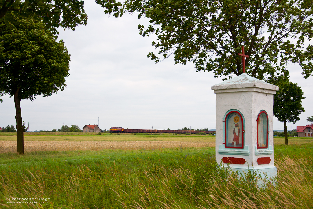 M62M-008 przewoźnika Rail Polska prowadzi skład pełny kruszywa z kopalni w Zimniki, koło Jawora, do Kołobrzegu w celu utworzenia czy uzupełnienia starego falochronu. Na zdjęciu Gagar mija przejazd w miejscowości Sobczyce tuż za Głogowem i kieruje się w stronę Wschowy. A przy drodze stała sobie taka kapliczka to aż żal było jej nie wykorzystać jako motyw :)