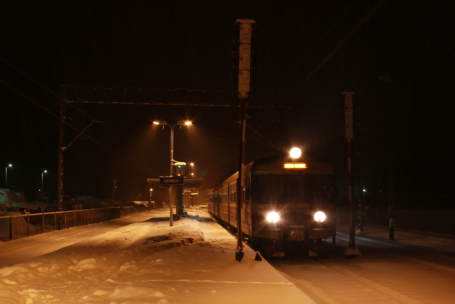Stacja Ustroń. Wieczorem na sennej stacji, jak przystało na ową porę roku EN57-992 jako Regio 317 relacji Katowice - Wisła Głębce zalicza krótki postój. Z tego co pamiętam, nikt nie wsiadł ani nie wysiadł. Sygnał S10 już podany - widoczne odbicie na zegarze peronowym. Była to ostatnia zima Przewozów Regionalnych na trasie do Wisły.
