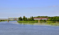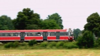 EN57-112 jako Regio 425 relacji Katowice - Zwardoń przed chwilą wyruszył ze stacji Milówka i pokonał most na rzece Sole.