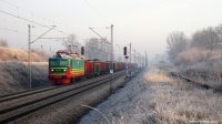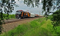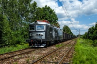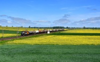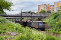 Knedel i roman DB Schenker prowadzą ładowny skład węglarek do Rzepina, pociąg zbliża się do Wrocławia od strony Siechnic.