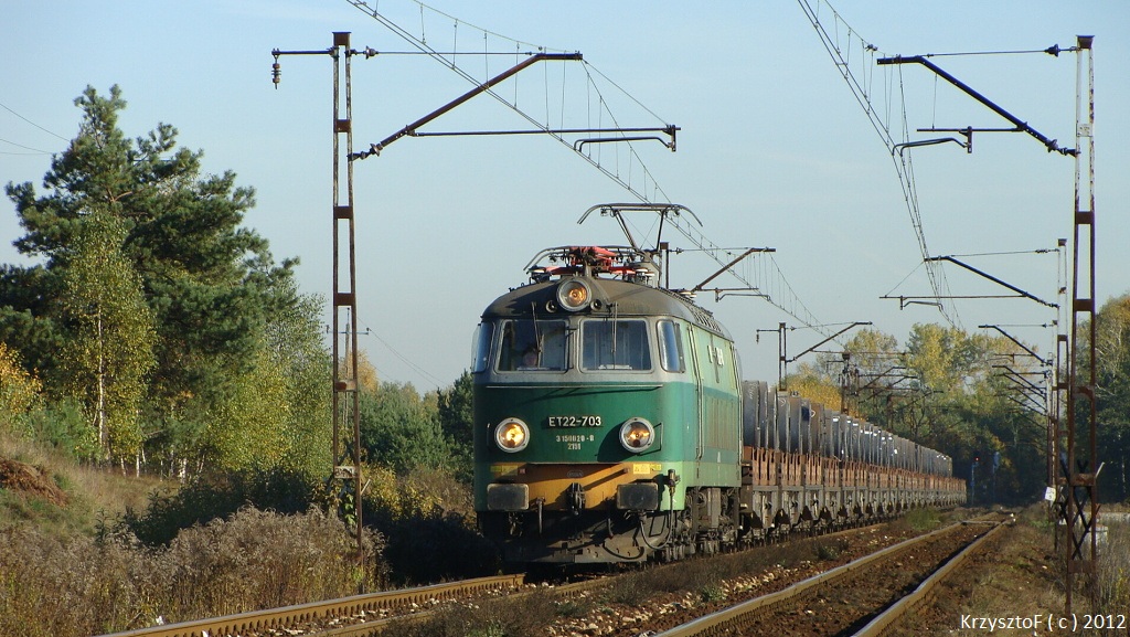 Byczek ET22-703, podąża ze składem platform załadowanych blachą rolowaną przez Młoszową, na szlaku Dulowa- Trzebinia.