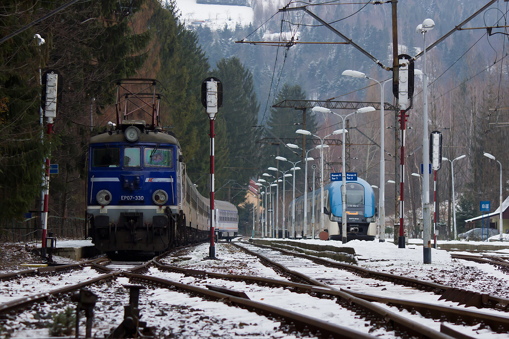 EP07-330 ze składem pociągu TLK 45502 "Pogoria" do Gdyni Głównej oczekuje na godzinę wyruszenia w trasę ze stacji Wisła Głębce. Przy peronie drugim EN76-001.