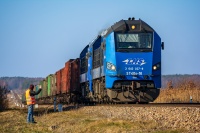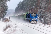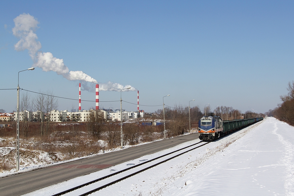 Robogagar ze składem pustych węglarek pędzi z widocznej w tle Elektrociepłowni Siekierki do Konstancina- Jeziornej.