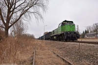 Pociąg towarowy (szerokotorowy) relacji Braniewo - BO Autostrada zasłonił sobą p.o. Bemowizna. Krawędź peronowa istnieje, ba - nawet na słupie wisi czytelny rozkład, jak nowy! Ale nieaktualny, nic tu osobowego jeździ... Pociąg obserwujemy ze starej nastawni, druga jest widoczna za składem, przy torze normalnym. Ich stan jest taki sam - totalna ruina. Na końcu składu mamy popych, SM48-048 napiera.