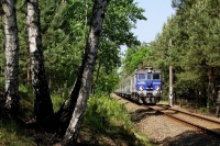 Zmodernizowana "Siódemka" ze składem kontenerów mija nieczynną już stacje Chromin.