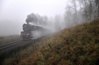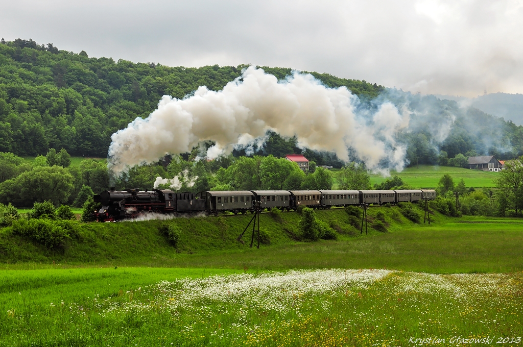 Ty42-107 prowadzi pociąg specjalny na trasie z Nowego Sącza do Chabówki. Przejazd odbył się w ramach trzeciej kolejowej majówki.