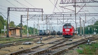 Gagarin z węglarkami rel. Braniewo - Szczecin Podjuchy wjeżdża do Chojnic, gdzie nastąpi zmiana maszynisty. Po lewej pozostałości po drugim torze.
