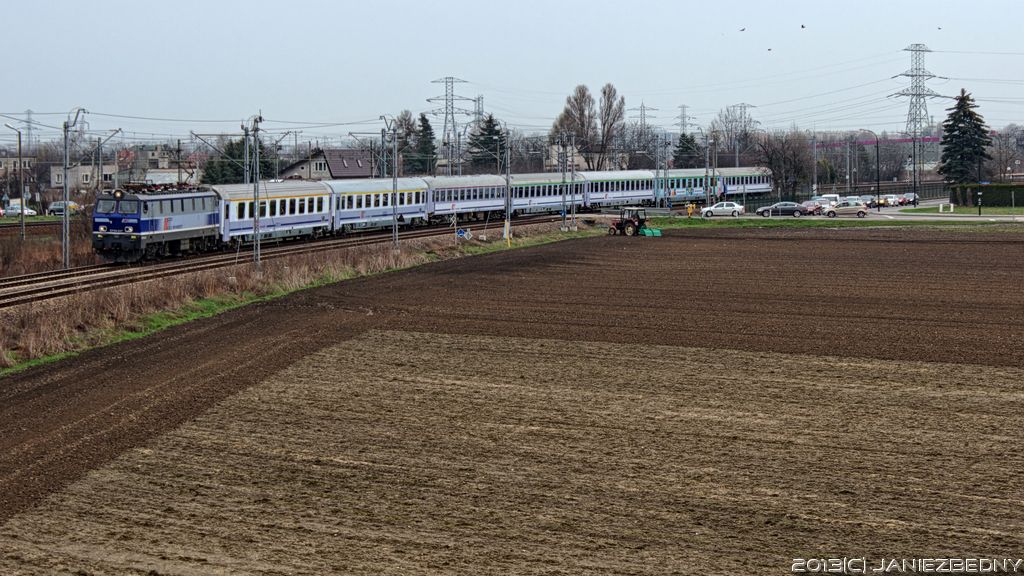 Objazdowy pociąg Ex TATRY relacji Warszawa Wschodnia - Zakopane przejeżdża przez przejazd na ul. Przejazdowej na warszawskich Gołąbkach.