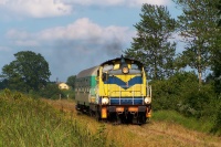 Strażak z pociągiem IR "Niegocin" z Poznania do Giżycka jedzie szlakiem Kętrzyn - Sterławki Wlk. tu złapany w okolicach lotniska Wilamowo (k. Kętrzyna). Jest to jedyny pociąg PR, który na tej lini obsługiwany jest składami wagonowymi. Wszelkie inne pociągi tego przewoźnika (czyt. Regio) kursują szynobusami.