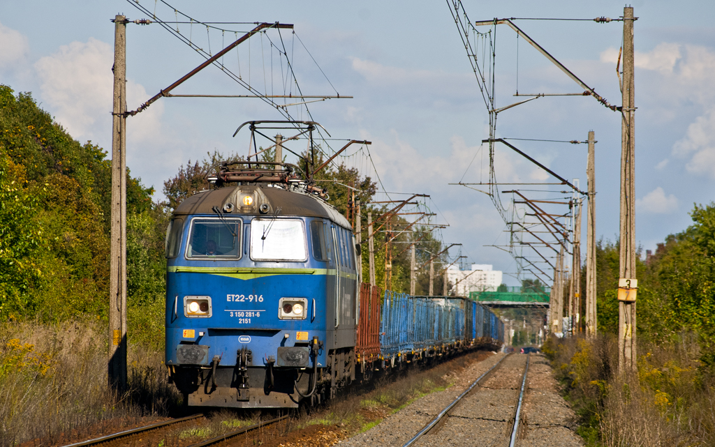 D29-14. Post.odg.Retkinia-Lublinek. ET22-916 wraz z mieszanym składem, jedzie w stronę Lublinka.