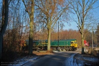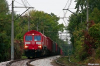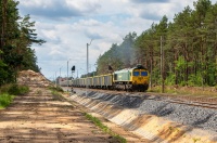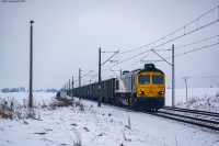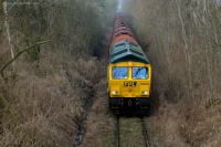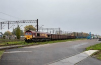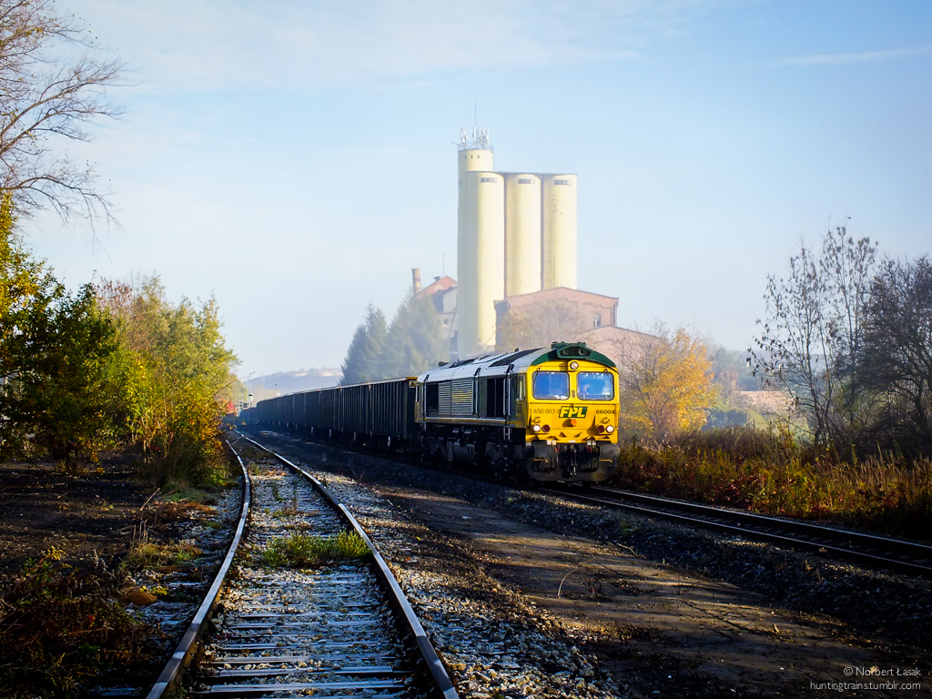 EMD Series 66 polskiego Freightlinera mknie z Rogoźnicy przez Strzegom. W chłodny, jesienny poranek oświetlony ostrym słońcem elewator przypomina akwarelę, a zielono-żółta bandera FPL doskonale komponuje się z barwami hibernującej podsudeckiej przyrody.
