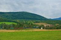 Gdy bez specjalnych nadziei szukałem miejscówki na nieuchronnie nadjeżdżające z Jaworzyny próżne wahadło pod załadunek w kopalni Eurovia Graniczna, wiatr potargał chmury i słońce oświetliło pagórki Przedgórza, mobilizując do spróbowania się z pejzażem. Mniejsza z tym, że zrobienie powyższej fotografii kosztowało mnie odmrożenie policzków i palców na pustym, zamarzniętym polu. Ale te dziesięć minut cierpliwego oczekiwania, wysłuchiwania w gwizdającym wietrze regularnego charkotu sulzera, a potem widok pięknego zielonego diesla wolno wiodącego pociąg na tle otwartej rany góry Granicznej wynagrodził cierpliwość i wysiłek...